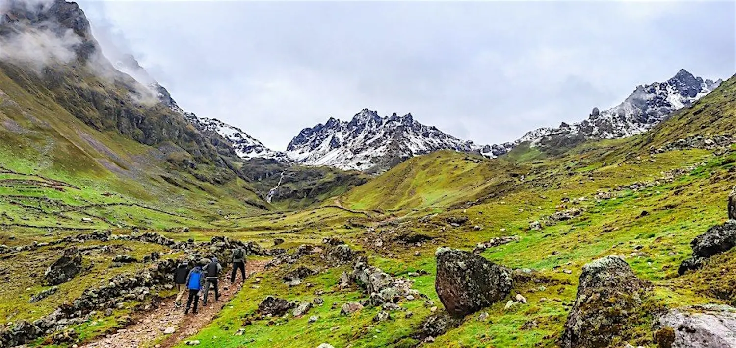 Ascendemos constantemente, atravesando un paisaje abierto y desarbolado de plantas y flores que se aferran al suelo entre pastos de pasto andino salpicado de rebaños itinerantes de alpacas y llamas. Alcanzando una altitud de 4.500 m (14.760 pies) cruzamos el paso de Ipsayccasa. El paso ofrece impresionantes vistas del Monte Verónica (5.750 m) y los picos nevados circundantes.