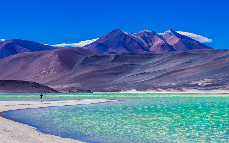 Salimos a las 06:00 hrs en un viaje a los géiseres Sol de Mañana (4850 metros), un cráter volcánico con humos de azufre y vapores de agua pesada. Visita después del Lago Salado antes de atravesar el desierto de Dalí. A la hora indicada arribo a la Laguna Verde al pie del volcán Licancabur (5.900 m), para observar el cambio de color de la laguna, finalizando el recorrido seremos trasladados a Uyuni, donde abordaremos el bus de retorno a la ciudad de La Paz, horario de salida del bus 9.00pm. (el viaje dura 10 horas, pernocte en el bus). (Foto: Laguna Verde).
